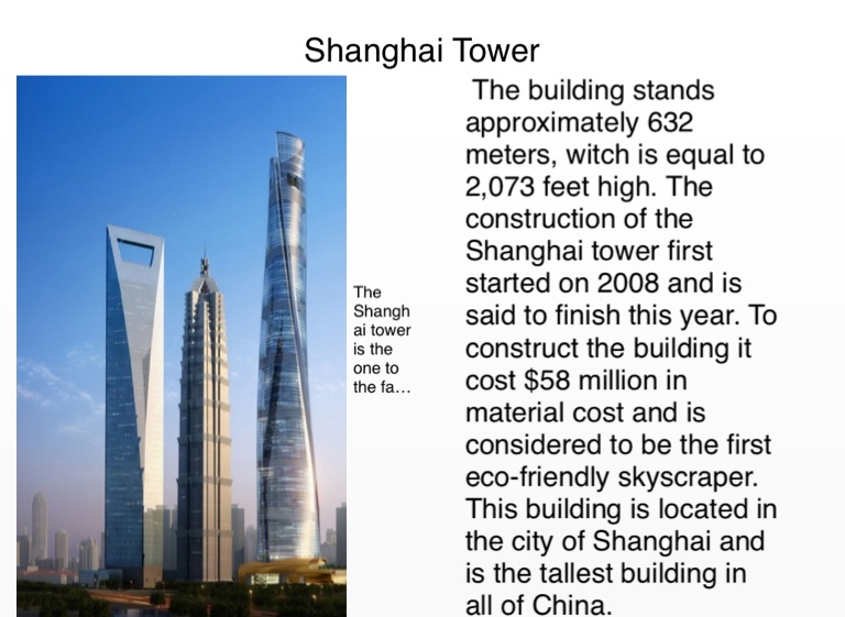 The building stands approximately 632 meters, witch is equal to 2,073 feet high. The construction of the Shanghai tower first started on 2008 and is said to finish this year. To construct the building it cost $58 million in material cost and is considered to be the first eco-friendly skyscraper. This building is located in the city of Shanghai and is the tallest building in all of China.