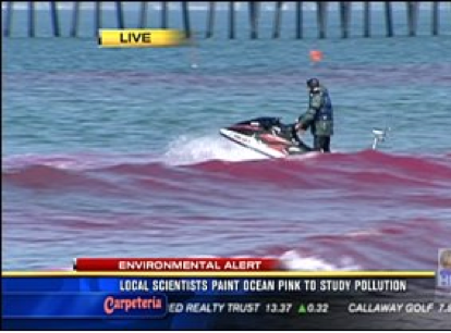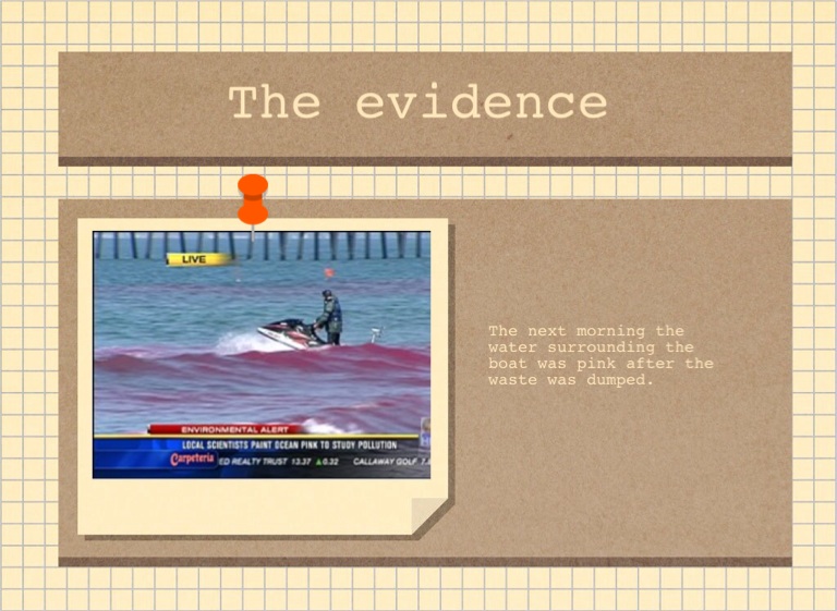 The next morning the water surrounding the boat was pink after the waste was dumped.