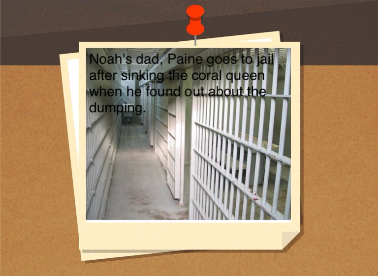 Noah's dad, Paine goes to jail after sinking the coral queen when he found out about the dumping.