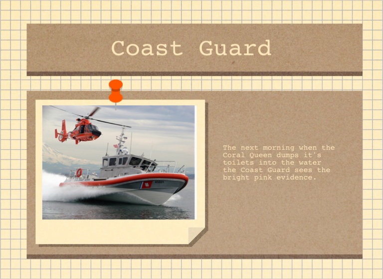 The next morning when the Coral Queen dumps it's toilets into the water the Coast Guard sees the bright pink evidence.