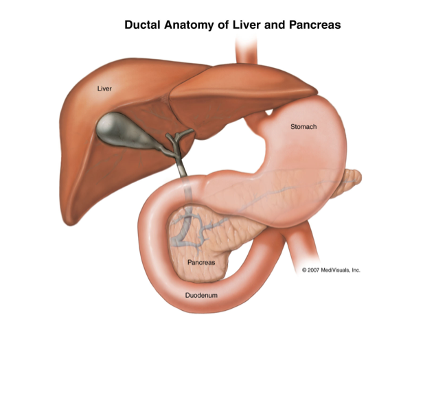 The large gland is the pancreas, which is connected to the duodenum. Here he is then on his way to the large intestine.