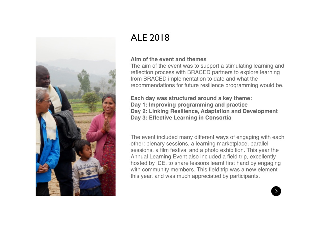The aim of the event was to support a stimulating learning and reflection process with BRACED partners to explore learning from BRACED implementation to date and what the recommendations for future resilience programming would be.
