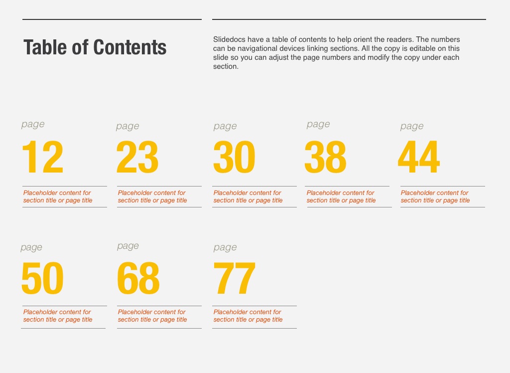 Slidedocs have a table of contents to help orient the readers. The numbers