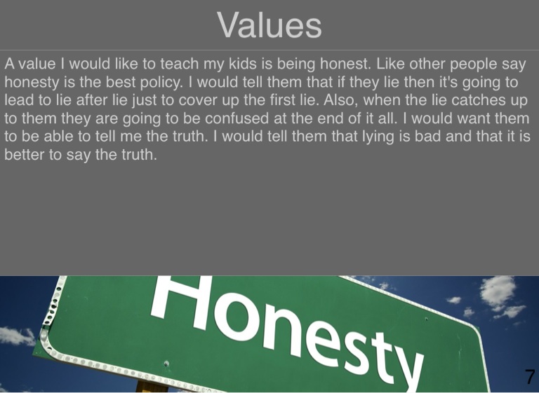 A value I would like to teach my kids is being honest. Like other people say honesty is the best policy. I would tell them that if they lie then it's going to lead to lie after lie just to cover up the first lie. Also, when the lie catches up to them they are going to be confused at the end of it all. I would want them to be able to tell me the truth. I would tell them that lying is bad and that it is better to say the truth.