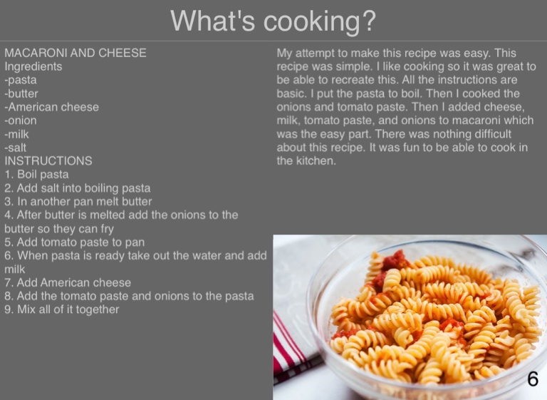 My attempt to make this recipe was easy. This recipe was simple. I like cooking so it was great to be able to recreate this. All the instructions are basic. I put the pasta to boil. Then I cooked the onions and tomato paste. Then I added cheese, milk, tomato paste, and onions to macaroni which was the easy part. There was nothing difficult about this recipe. It was fun to be able to cook in the kitchen.