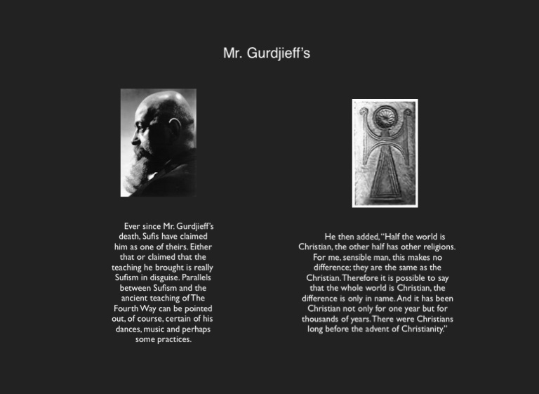 Ever since Mr. Gurdjieff’s death, Sufis have claimed him as one of theirs. Either that or claimed that the teaching he brought is really Sufism in disguise. Parallels between Sufism and the ancient teaching of The Fourth Way can be pointed out, of course, certain of his dances, music and perhaps some practices.