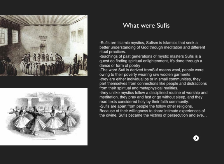 -Sufis are Islamic mystics, Sufism is Islamics that seek a better understanding of God through meditation and different ritual practices.