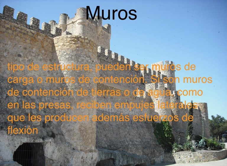 tipo de estructura, pueden ser muros de carga o muros de contención. Si son muros de contención de tierras o de agua, como en las presas, reciben empujes laterales que les producen además esfuerzos de flexión