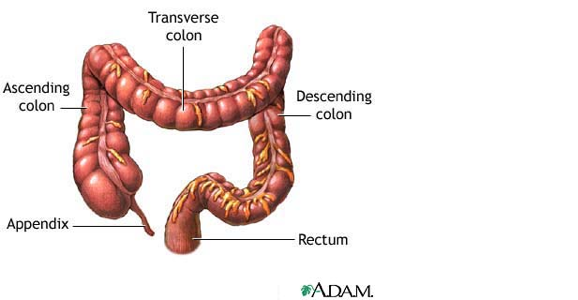 Now where does all that waste go? The large intestine that is where. The waste goes down and down until it gets to almost the bottom of the large intestine(about 5 feet long) where it comes upon the colon. The colon sucks out the remaining water, and then the big brown, or feces is formed. The large intestine pushes it into the rectum where it sits until your ready to use the restroom.when you use the restroom you push the big brown through the anus into the toilet and meanwhile this process continues on and on. Now is that something to chew on or what?