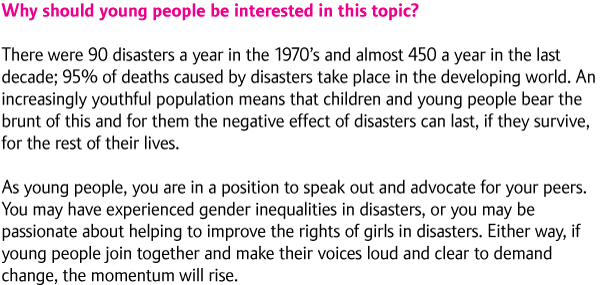 Adolescent girls are often overlooked and classed as ‘women’ or ‘children’, when in fact it is very important that they are recognised as having particular needs in terms of their education, safety, healthcare and participation. When they reach adolescence, girls can come up against pressure to marry, to be involved in sexual relationships, to drop out of school, or to stay at home and care for younger children and support their mothers with housework. Disasters often bring financial and emotional strain on families; parents may lose their jobs, homes may be destroyed. Adolescent girls are often the first to miss out on schooling, and can find themselves propelled into an early marriage so that their cash-strapped families have one less mouth to feed.