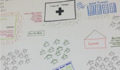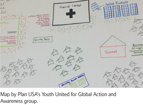 Plan International’s UK and US youth groups mapped out a hypothetical refugee camp that would provide safe and supportive environments for girls, by highlighting areas such as separate facilities for unaccompanied children and separated sleeping and washing areas, lighting, easily accessible education and health centres for females and security.
