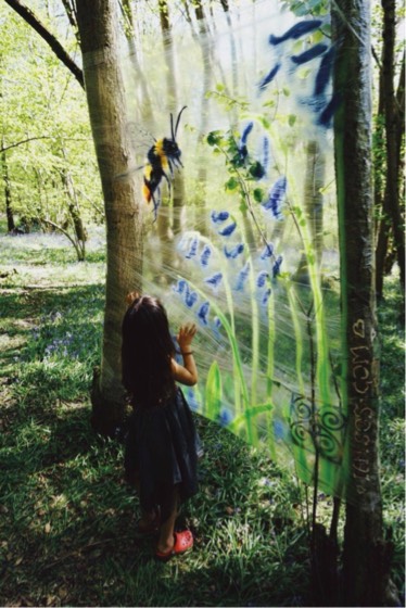 You wouldn’t usually put cellophane, spray-paint and nature together, but my “Cellograffiti” installations have been delighting visitors to festivals and immersive events for the last few years. Sometimes l create an artwork in the woods to be discovered by unsuspecting people during their meanderings. Whatever the surface, my semi realistic artwork style represents nature in large scale. There is an element of fantasy and a soft focus illustrative quality to the finished pieces I create.