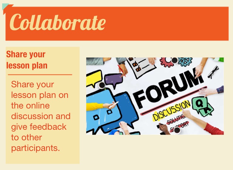 Share your lesson plan on the online discussion and give feedback to other participants.