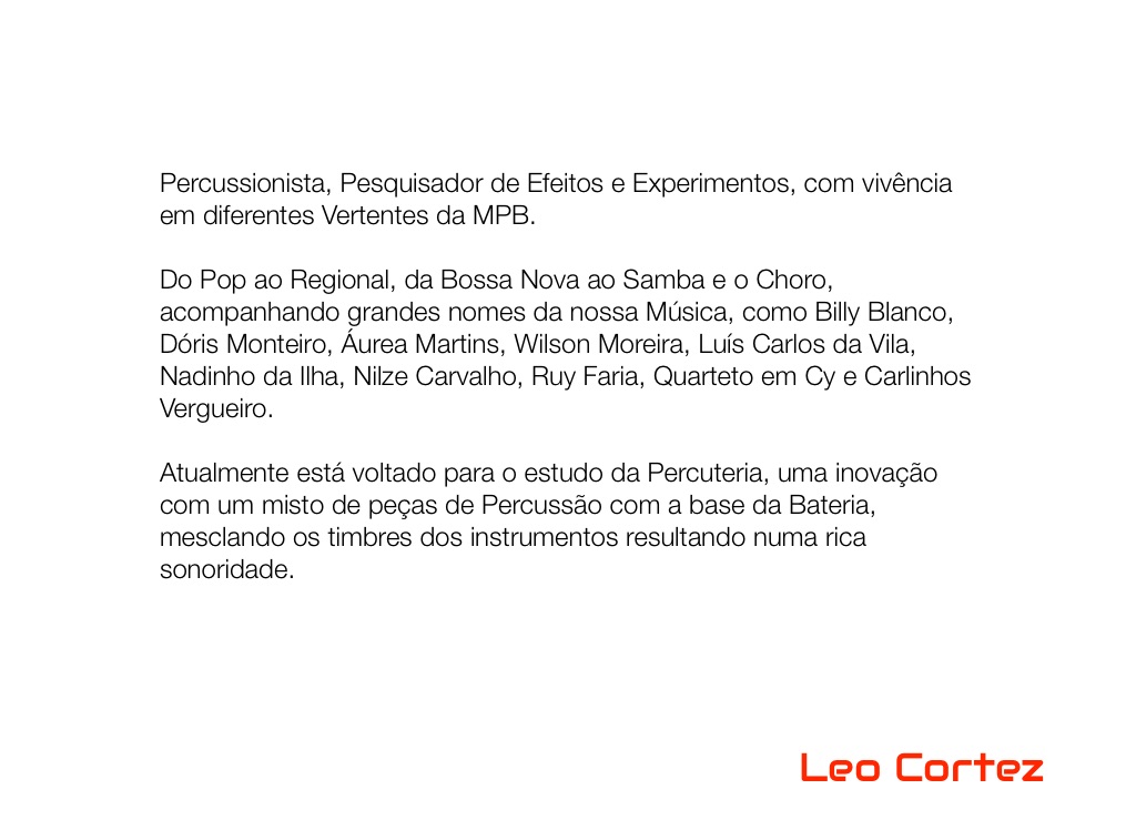 Percussionista, Pesquisador de Efeitos e Experimentos, com vivência em diferentes Vertentes da MPB.