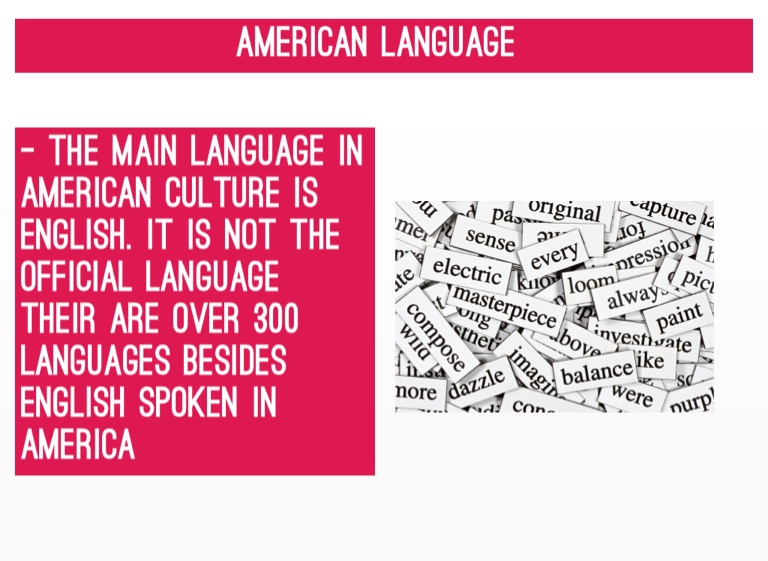 - the main language in American culture is english. It is not the official language their are over 300 languages besides English spoken in America