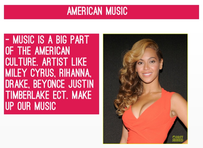 - music is a big part of the American culture. Artist like Miley Cyrus, Rihanna, drake, beyonce Justin timberlake ect. Make up our music
