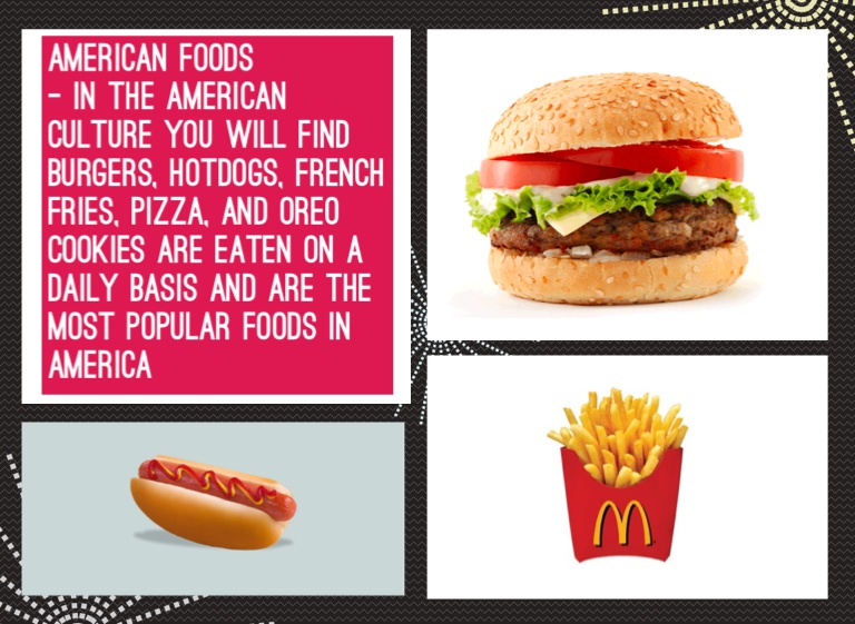 - in the American culture you will find burgers, hotdogs, French fries, pizza, and Oreo cookies are eaten on a daily basis and are the most popular foods in America
