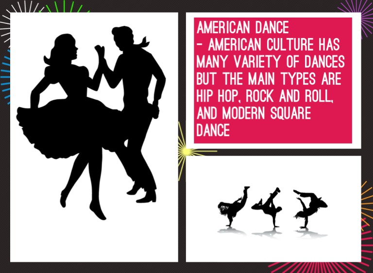- american culture has many variety of dances but the main types are hip hop, rock and roll, and modern square dance