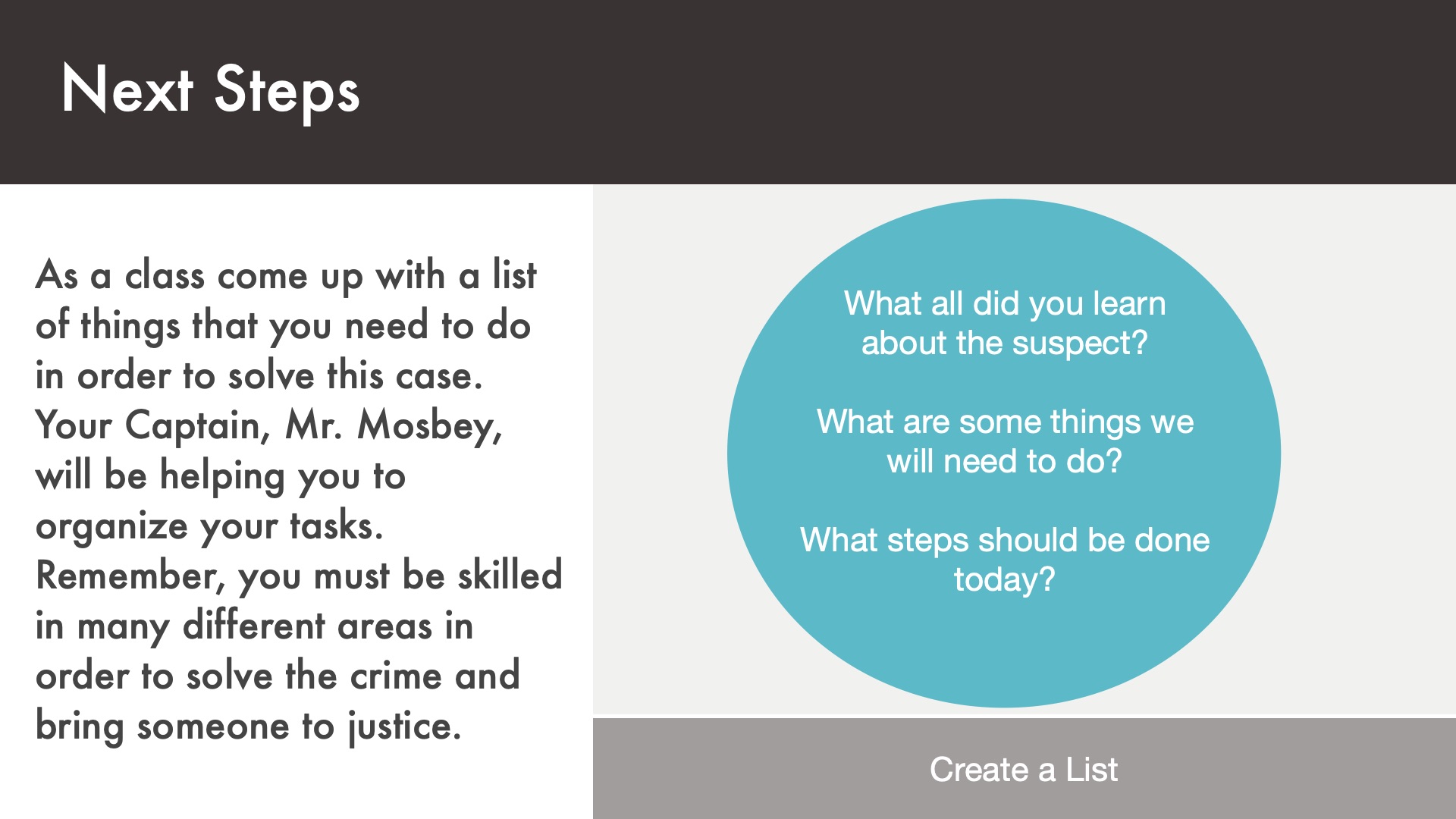 As a class come up with a list of things that you need to do in order to solve this case. Your Captain, Mr. Mosbey, will be helping you to organize your tasks. Remember, you must be skilled in many different areas in order to solve the crime and bring someone to justice.