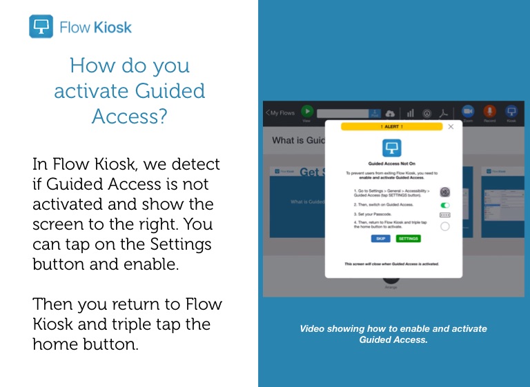 In Flow Kiosk, we detect if Guided Access is not activated and show the screen to the right. You can tap on the Settings button and enable.