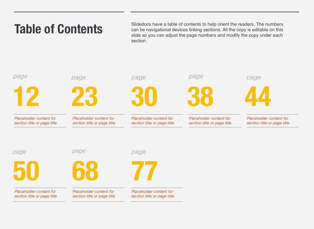 Slidedocs have a table of contents to help orient the readers. The numbers