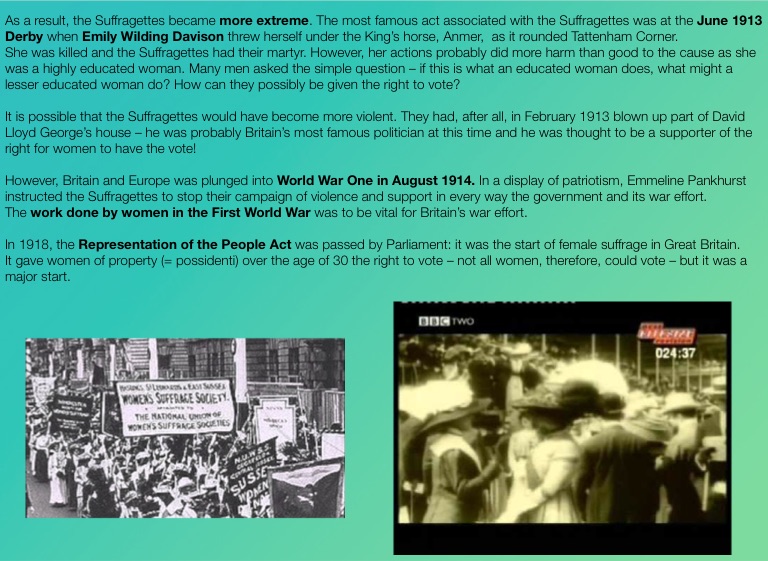 It is possible that the Suffragettes would have become more violent. They had, after all, in February 1913 blown up part of David Lloyd George’s house – he was probably Britain’s most famous politician at this time and he was thought to be a supporter of the right for women to have the vote!