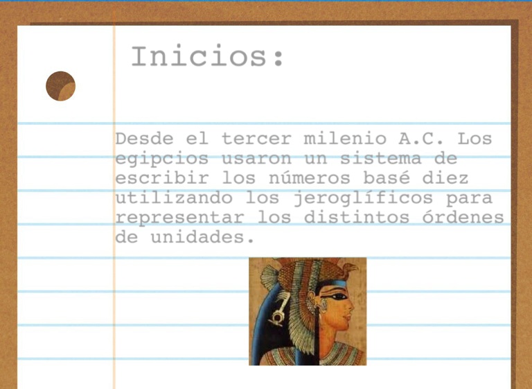 Desde el tercer milenio A.C. Los egipcios usaron un sistema de escribir los números basé diez utilizando los jeroglíficos para representar los distintos órdenes de unidades.