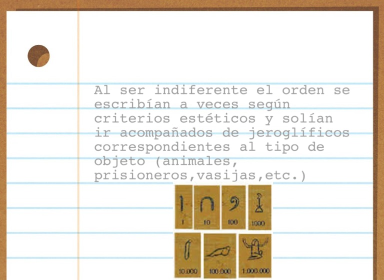 Al ser indiferente el orden se escribían a veces según criterios estéticos y solían ir acompañados de jeroglíficos correspondientes al tipo de objeto (animales, prisioneros,vasijas,etc.)