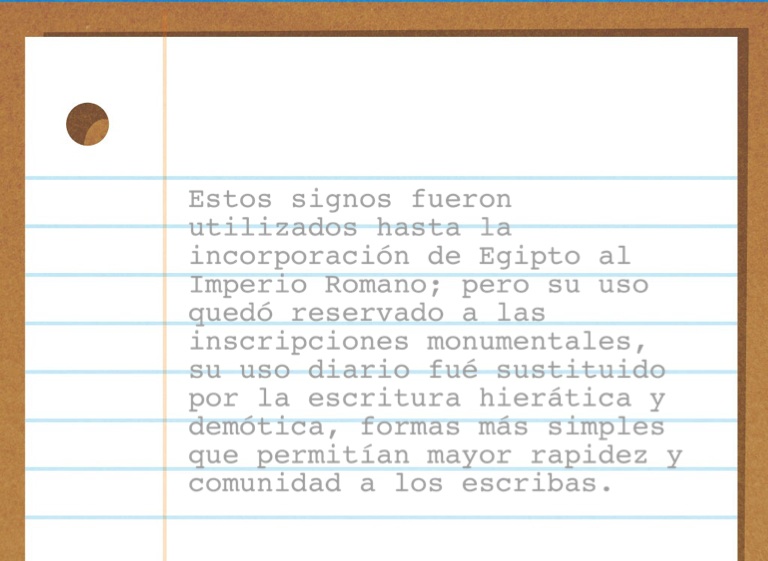 Estos signos fueron utilizados hasta la incorporación de Egipto al Imperio Romano; pero su uso quedó reservado a las inscripciones monumentales, su uso diario fué sustituido por la escritura hierática y demótica, formas más simples que permitían mayor rapidez y comunidad a los escribas.