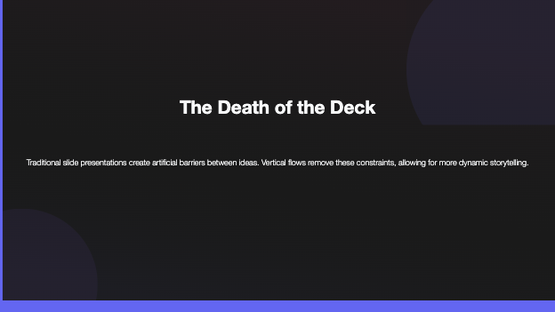 Traditional slide presentations create artificial barriers between ideas. Vertical flows remove these constraints, allowing for more dynamic storytelling.