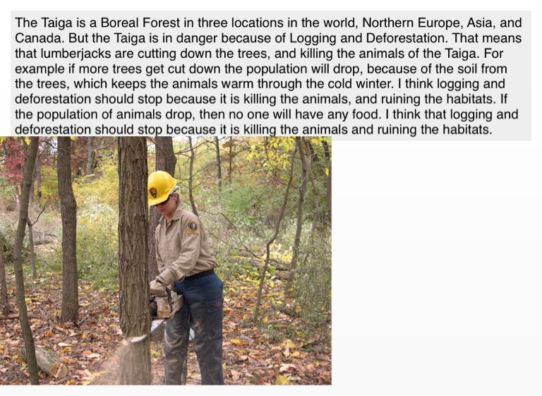 The Taiga is a Boreal Forest in three locations in the world, Northern Europe, Asia, and Canada. But the Taiga is in danger because of Logging and Deforestation. That means that lumberjacks are cutting down the trees, and killing the animals of the Taiga. For example if more trees get cut down the population will drop, because of the soil from the trees, which keeps the animals warm through the cold winter. I think logging and deforestation should stop because it is killing the animals, and ruining the habitats. If the population of animals drop, then no one will have any food. I think that logging and deforestation should stop because it is killing the animals and ruining the habitats.