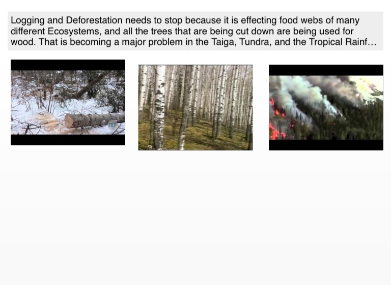 Logging and Deforestation needs to stop because it is effecting food webs of many different Ecosystems, and all the trees that are being cut down are being used for wood. That is becoming a major problem in the Taiga, Tundra, and the Tropical Rainforest