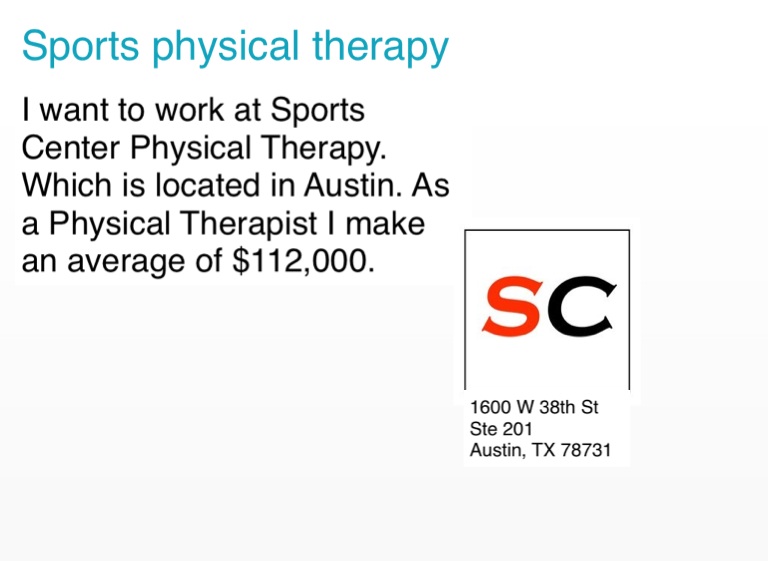 I want to work at Sports Center Physical Therapy. Which is located in Austin. As a Physical Therapist I make an average of $112,000.