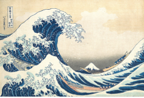 Interpret: This piece speaks of the raw power and intimidating size of nature. This pouncing wave in the already tumultuous sea seems daunting and the small boats floating in the water look weak and fragile. This piece speaks of the power of nature over man. These boats have no chance against the great wave about to break over their heads.