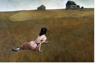 Interpret: The contrasting forms of both Christina and the houses highlight both her and her goal. The lighter colors of Christina against the darker, more muted background put emphasis on the hope of her character. The textured look of the painting creates a realistic feel.
