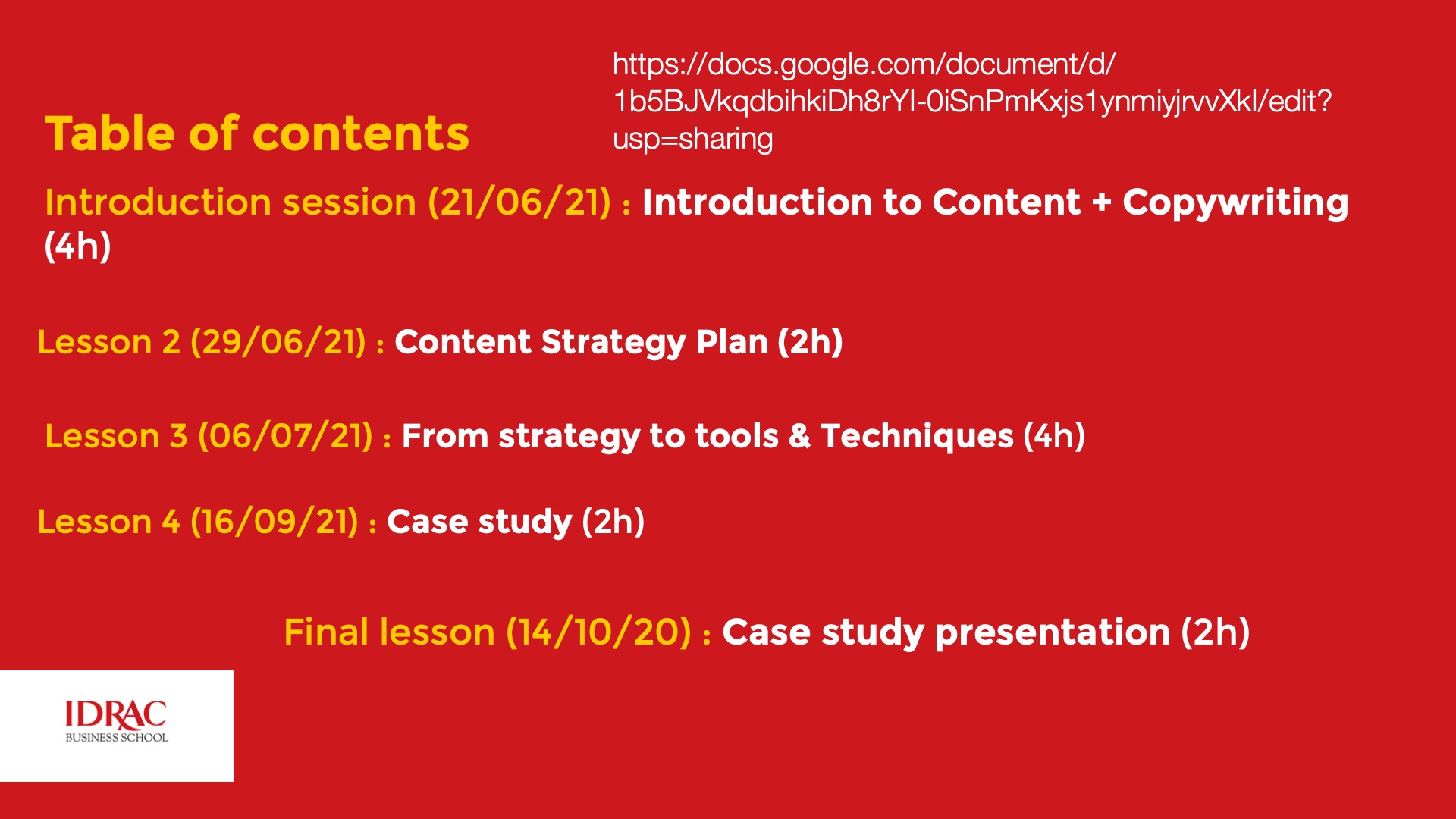 Final lesson (14/10/20) : Case study presentation (2h)