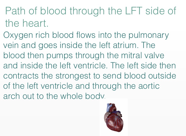 Oxygen rich blood flows into the pulmonary vein and goes inside the left atrium. The blood then pumps through the mitral valve and inside the left ventricle. The left side then contracts the strongest to send blood outside of the left ventricle and through the aortic arch out to the whole body.
