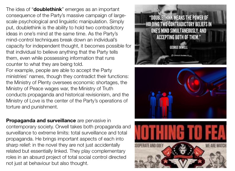 Propaganda and surveillance are pervasive in contemporary society. Orwell takes both propaganda and surveillance to extreme limits: total surveillance and total propaganda. He brings important aspects of each into sharp relief: in the novel they are not just accidentally related but essentially linked. They play complementary roles in an absurd project of total social control directed not just at behaviour but also thought.