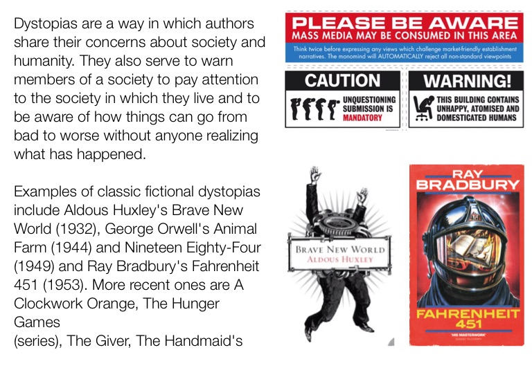 Dystopias are a way in which authors share their concerns about society and humanity. They also serve to warn members of a society to pay attention to the society in which they live and to be aware of how things can go from bad to worse without anyone realizing what has happened.