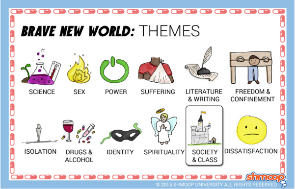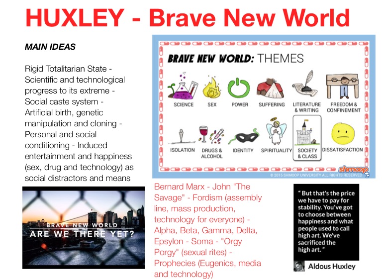 Bernard Marx - John "The Savage" - Fordism (assembly line, mass production, technology for everyone) - Alpha, Beta, Gamma, Delta, Epsylon - Soma - "Orgy Porgy" (sexual rites) - Prophecies (Eugenics, media and technology)