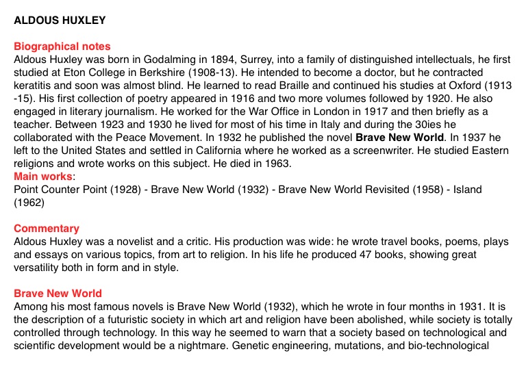 Aldous Huxley was born in Godalming in 1894, Surrey, into a family of distinguished intellectuals, he first studied at Eton College in Berkshire (1908-13). He intended to become a doctor, but he contracted keratitis and soon was almost blind. He learned to read Braille and continued his studies at Oxford (1913 -15). His first collection of poetry appeared in 1916 and two more volumes followed by 1920. He also engaged in literary journalism. He worked for the War Office in London in 1917 and then briefly as a teacher. Between 1923 and 1930 he lived for most of his time in Italy and during the 30ies he collaborated with the Peace Movement. In 1932 he published the novel Brave New World. In 1937 he left to the United States and settled in California where he worked as a screenwriter. He studied Eastern religions and wrote works on this subject. He died in 1963.