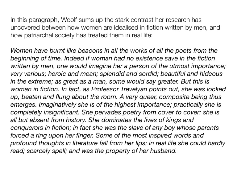In this paragraph, Woolf sums up the stark contrast her research has uncovered between how women are idealised in fiction written by men, and how patriarchal society has treated them in real life: