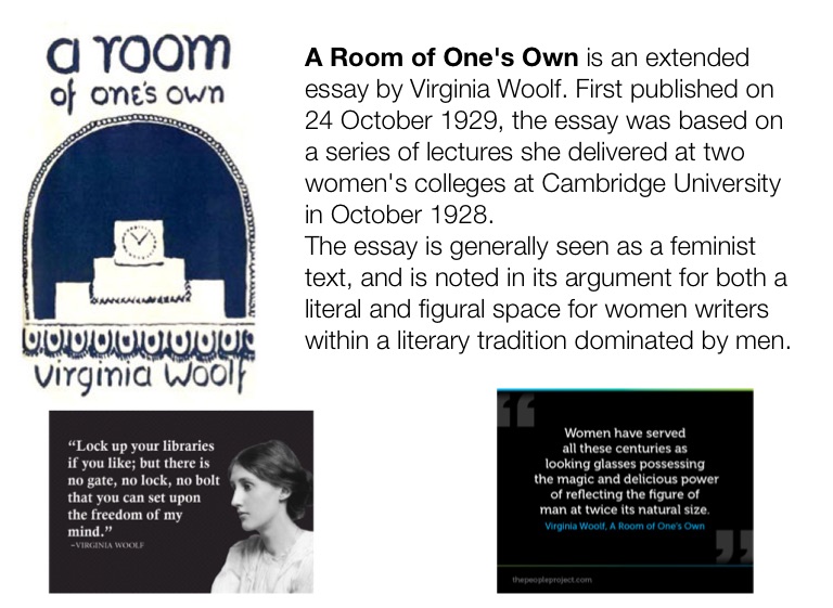 A Room of One's Own is an extended essay by Virginia Woolf. First published on 24 October 1929, the essay was based on a series of lectures she delivered at two women's colleges at Cambridge University in October 1928.