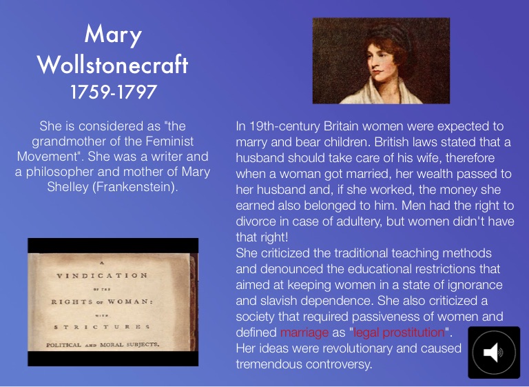 She is considered as "the grandmother of the Feminist Movement". She was a writer and a philosopher and mother of Mary Shelley (Frankenstein).