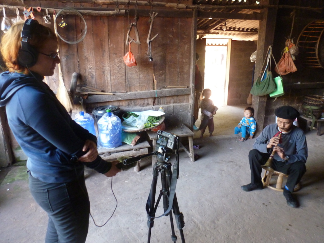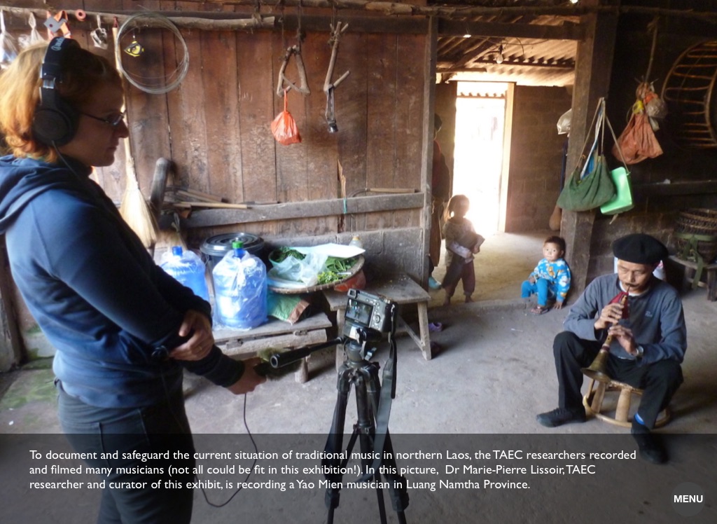 To document and safeguard the current situation of traditional music in northern Laos, the TAEC researchers recorded and filmed many musicians (not all could be fit in this exhibition!). In this picture, Dr Marie-Pierre Lissoir, TAEC researcher and curator of this exhibit, is recording a Yao Mien musician in Luang Namtha Province.