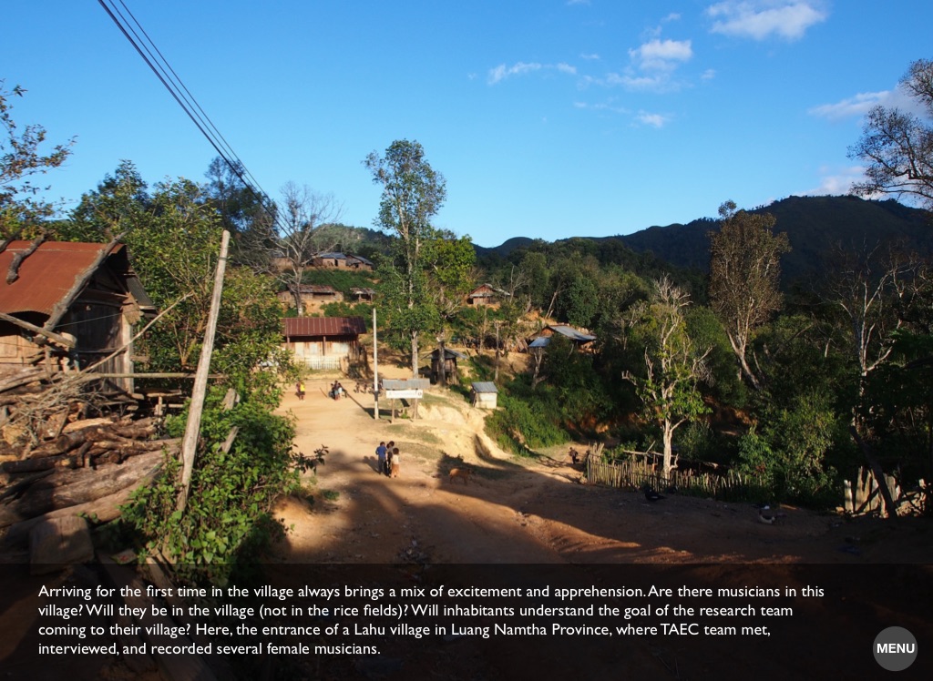 Arriving for the first time in the village always brings a mix of excitement and apprehension. Are there musicians in this village? Will they be in the village (not in the rice fields)? Will inhabitants understand the goal of the research team coming to their village? Here, the entrance of a Lahu village in Luang Namtha Province, where TAEC team met, interviewed, and recorded several female musicians.
