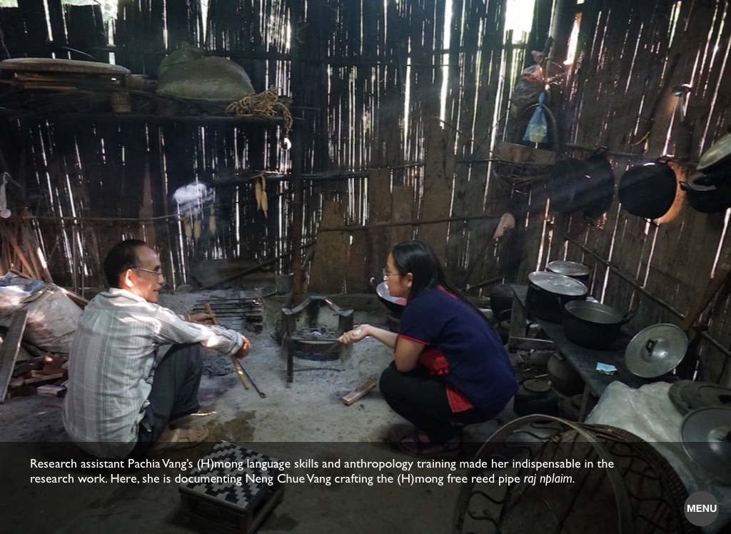 Research assistant Pachia Vang’s (H)mong language skills and anthropology training made her indispensable in the research work. Here, she is documenting Neng Chue Vang crafting the (H)mong free reed pipe raj nplaim.