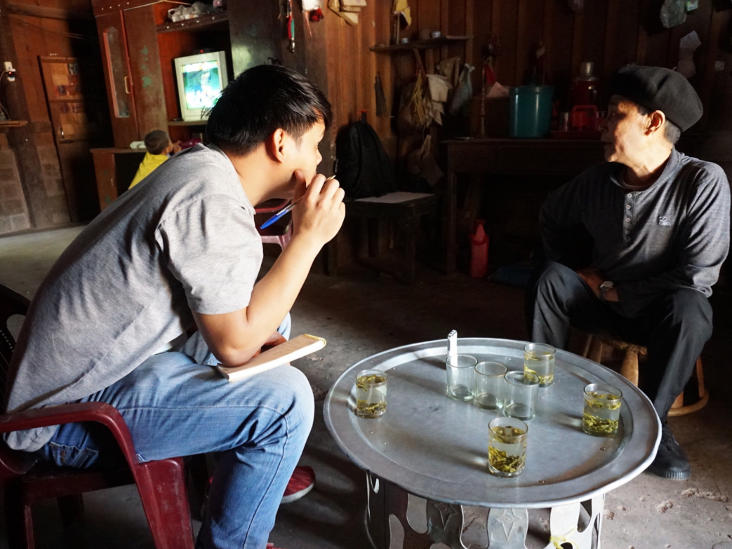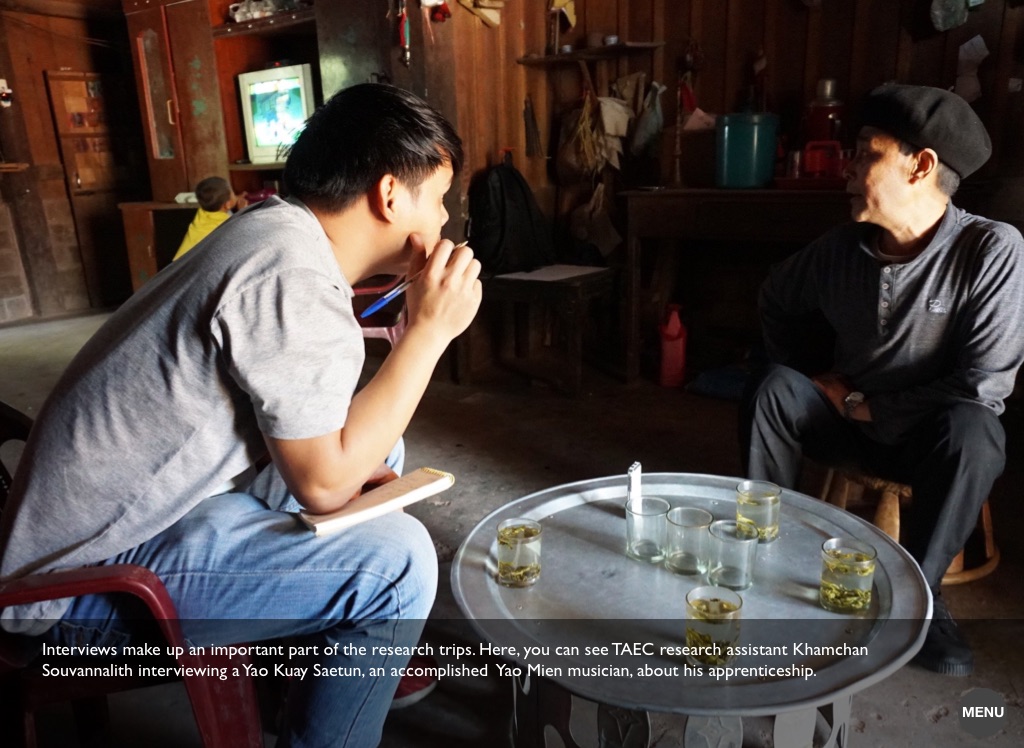Interviews make up an important part of the research trips. Here, you can see TAEC research assistant Khamchan Souvannalith interviewing a Yao Kuay Saetun, an accomplished Yao Mien musician, about his apprenticeship.