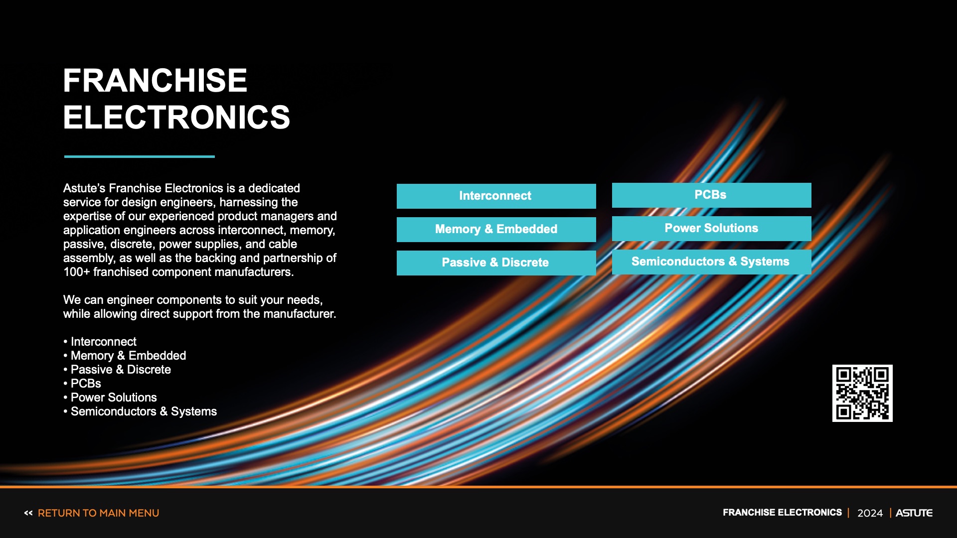 Astute’s Franchise Electronics is a dedicated service for design engineers, harnessing the expertise of our experienced product managers and application engineers across interconnect, memory, passive, discrete, power supplies, and cable assembly, as well as the backing and partnership of 100+ franchised component manufacturers.