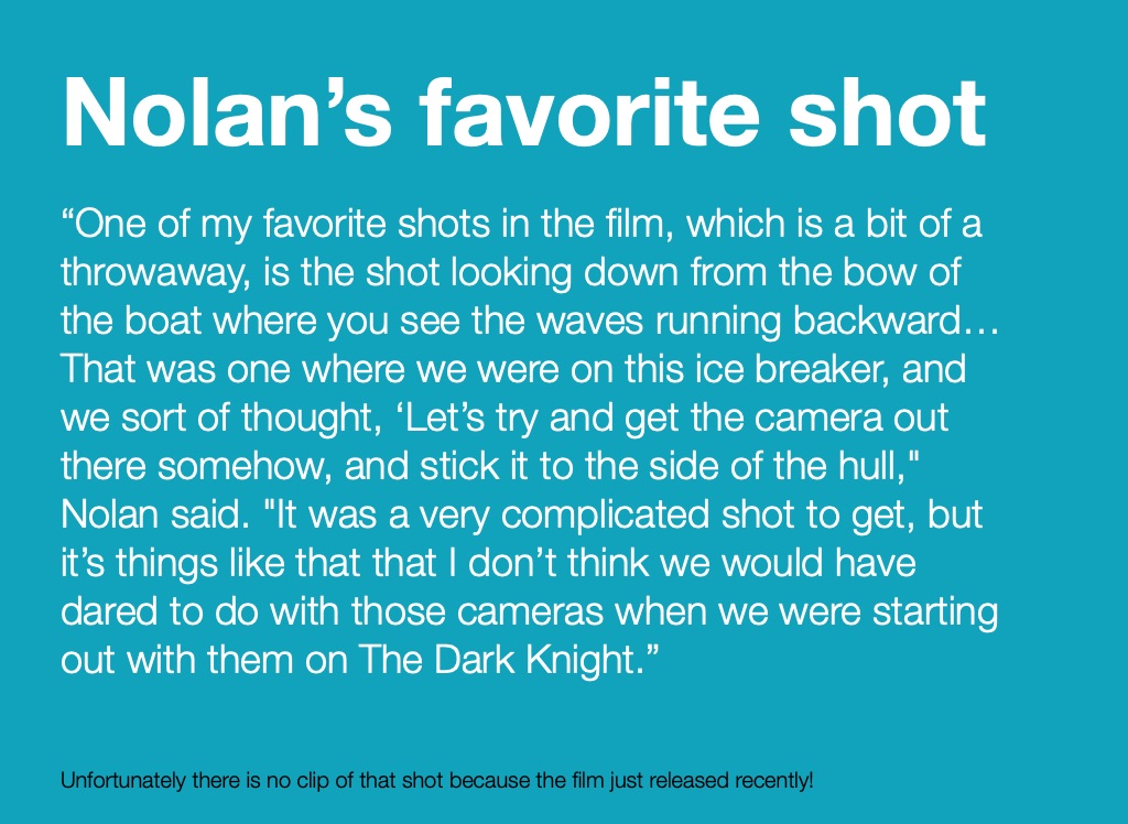“One of my favorite shots in the film, which is a bit of a throwaway, is the shot looking down from the bow of the boat where you see the waves running backward… That was one where we were on this ice breaker, and we sort of thought, ‘Let’s try and get the camera out there somehow, and stick it to the side of the hull," Nolan said. "It was a very complicated shot to get, but it’s things like that that I don’t think we would have dared to do with those cameras when we were starting out with them on The Dark Knight.”